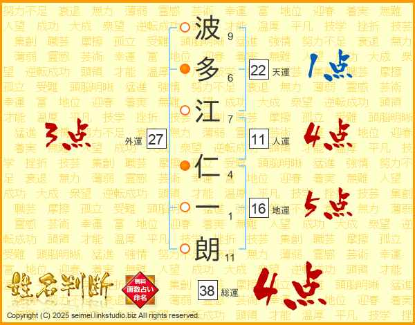 波(9画)多(6画)江(7画) 仁(4画)一(1画)朗(11画)