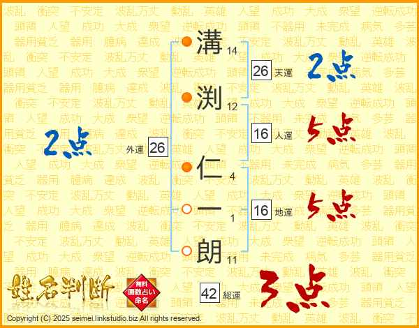 溝(14画)渕(12画) 仁(4画)一(1画)朗(11画)