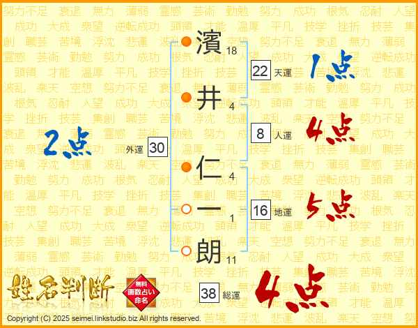濱(18画)井(4画) 仁(4画)一(1画)朗(11画)