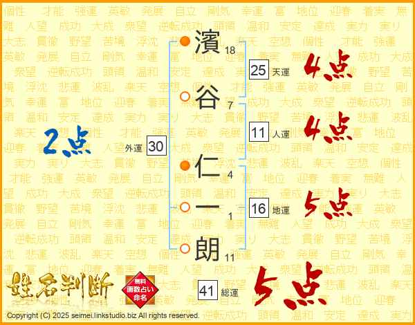 濱(18画)谷(7画) 仁(4画)一(1画)朗(11画)