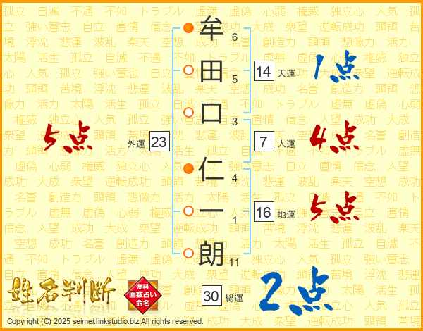 牟(6画)田(5画)口(3画) 仁(4画)一(1画)朗(11画)
