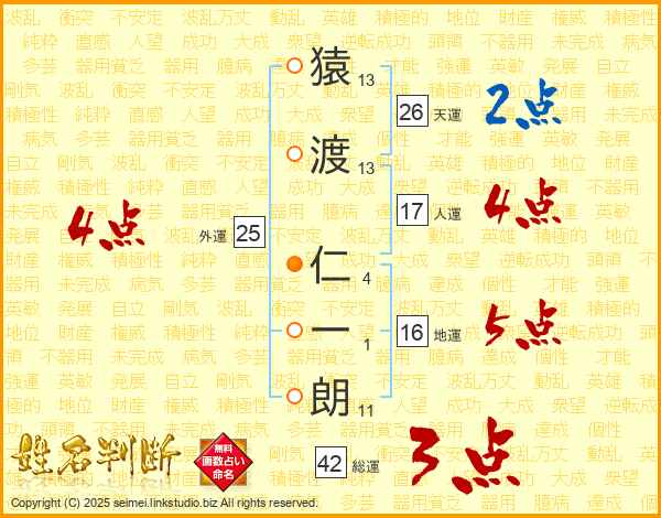 猿(13画)渡(13画) 仁(4画)一(1画)朗(11画)
