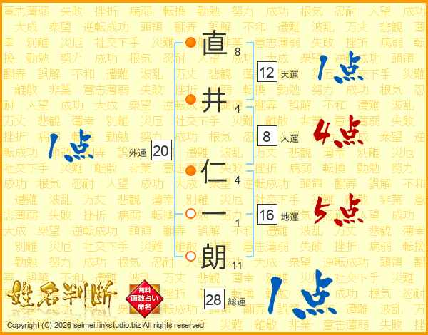 直(8画)井(4画) 仁(4画)一(1画)朗(11画)