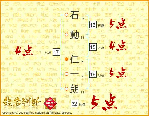 石(5画)動(11画) 仁(4画)一(1画)朗(11画)