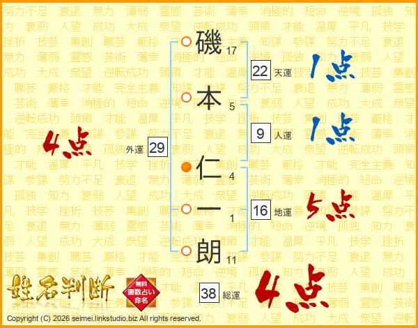 磯(17画)本(5画) 仁(4画)一(1画)朗(11画)