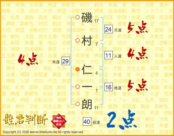 磯(17画)村(7画) 仁(4画)一(1画)朗(11画)