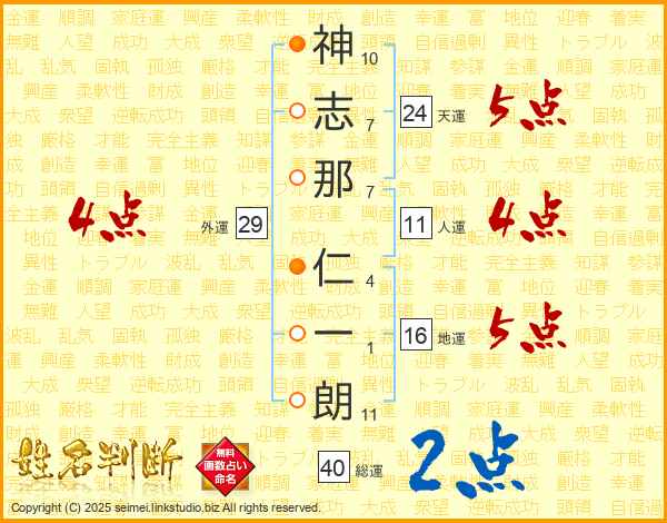 神(10画)志(7画)那(7画) 仁(4画)一(1画)朗(11画)