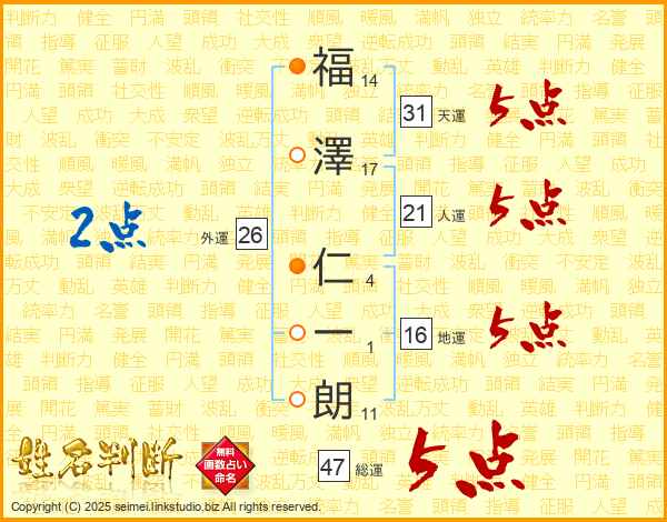 福(14画)澤(17画) 仁(4画)一(1画)朗(11画)