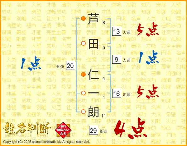 芦(8画)田(5画) 仁(4画)一(1画)朗(11画)