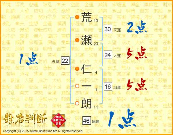 荒(10画)瀬(20画) 仁(4画)一(1画)朗(11画)