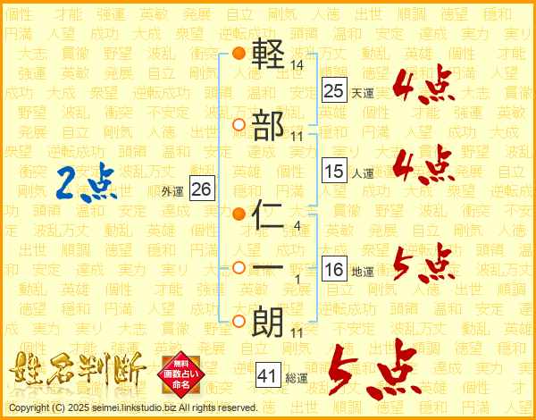 軽(14画)部(11画) 仁(4画)一(1画)朗(11画)