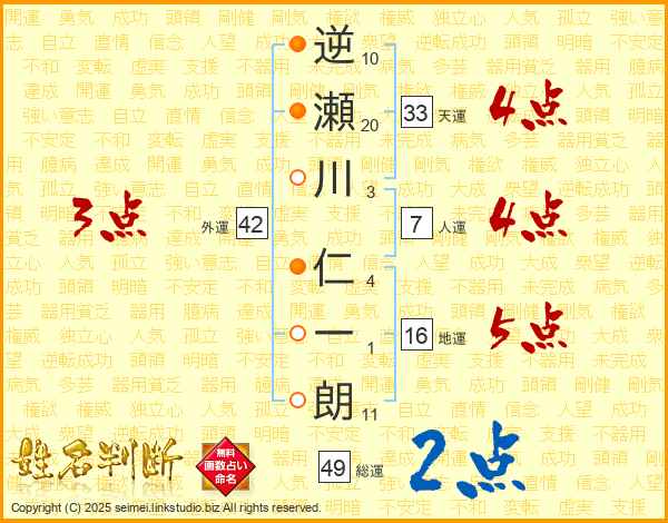 逆(10画)瀬(20画)川(3画) 仁(4画)一(1画)朗(11画)