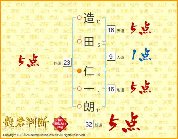 造(11画)田(5画) 仁(4画)一(1画)朗(11画)