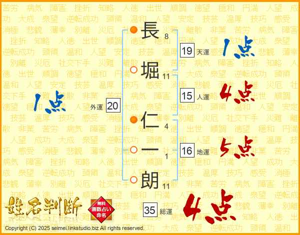 長(8画)堀(11画) 仁(4画)一(1画)朗(11画)