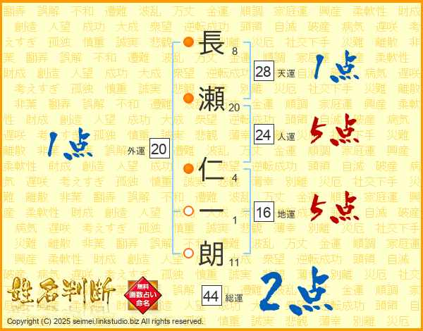 長(8画)瀬(20画) 仁(4画)一(1画)朗(11画)