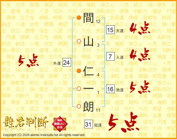 間(12画)山(3画) 仁(4画)一(1画)朗(11画)