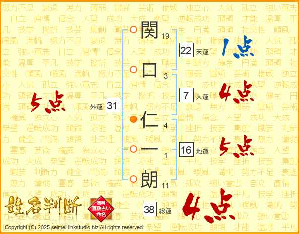 関(19画)口(3画) 仁(4画)一(1画)朗(11画)