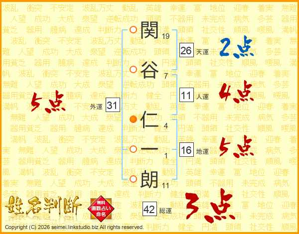 関(19画)谷(7画) 仁(4画)一(1画)朗(11画)