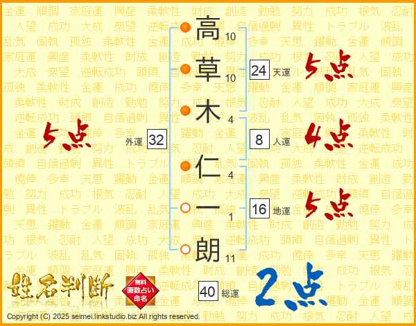 高(10画)草(10画)木(4画) 仁(4画)一(1画)朗(11画)