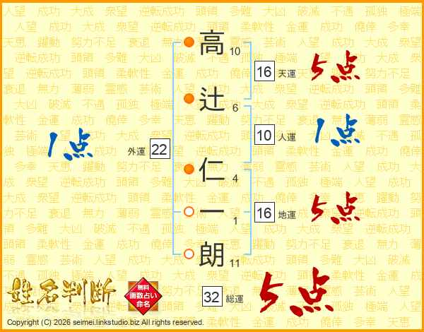 高(10画)辻(6画) 仁(4画)一(1画)朗(11画)