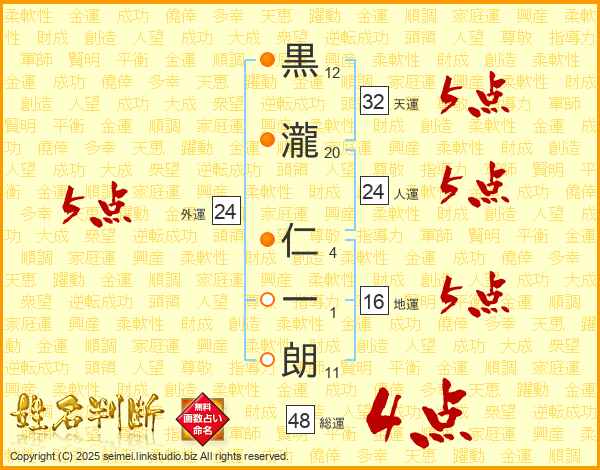 黒(12画)瀧(20画) 仁(4画)一(1画)朗(11画)