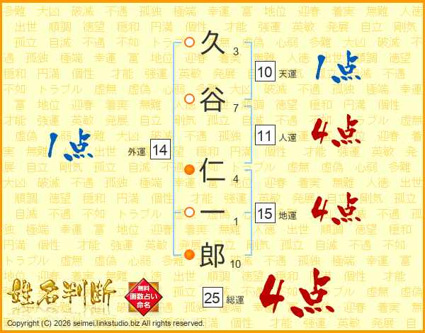 久(3画)谷(7画) 仁(4画)一(1画)郎(10画)
