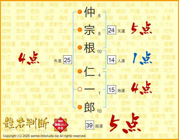 仲宗根仁一郎さんの総運は39画の5点!