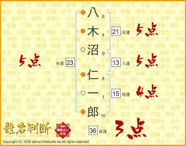 八木沼仁一郎さんの総運は36画の3点!