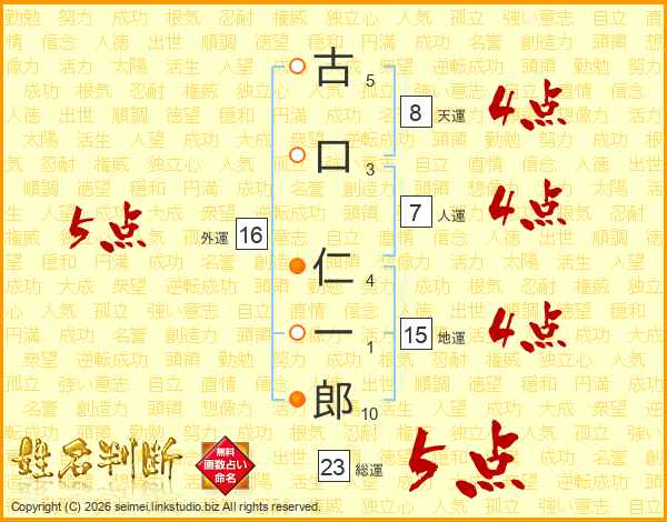 古(5画)口(3画) 仁(4画)一(1画)郎(10画)