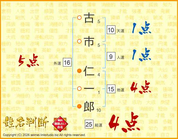 古(5画)市(5画) 仁(4画)一(1画)郎(10画)