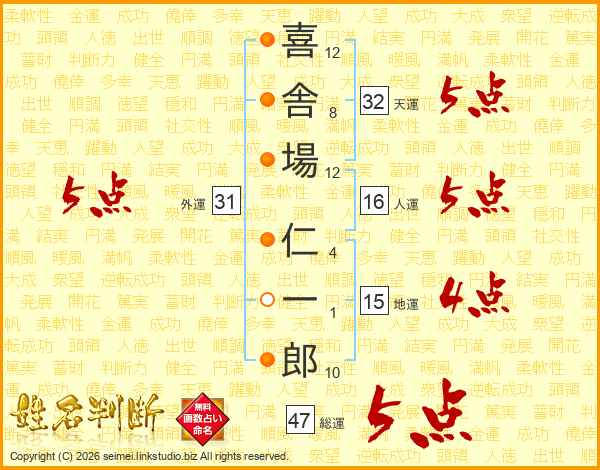喜(12画)舎(8画)場(12画) 仁(4画)一(1画)郎(10画)