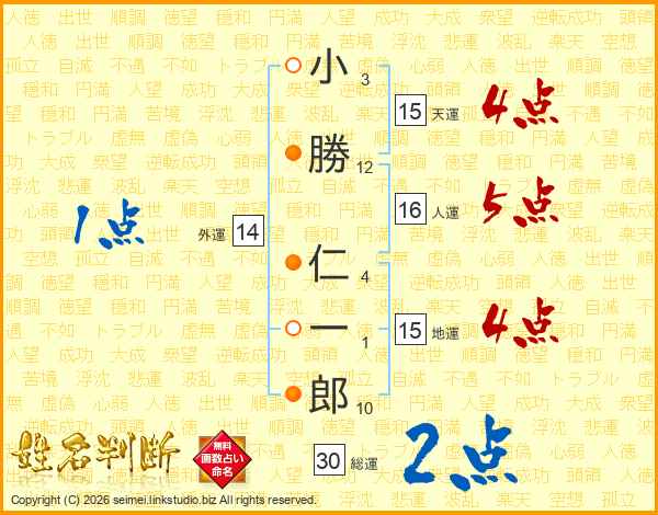 小(3画)勝(12画) 仁(4画)一(1画)郎(10画)