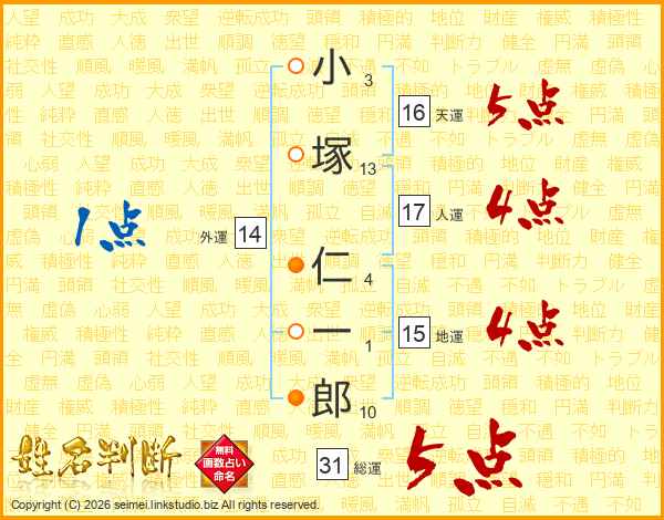 小(3画)塚(13画) 仁(4画)一(1画)郎(10画)