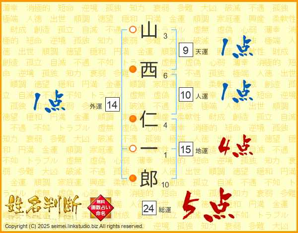 山(3画)西(6画) 仁(4画)一(1画)郎(10画)