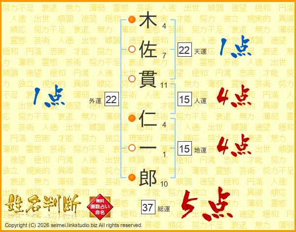 木(4画)佐(7画)貫(11画) 仁(4画)一(1画)郎(10画)