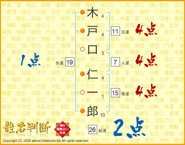 木(4画)戸(4画)口(3画) 仁(4画)一(1画)郎(10画)