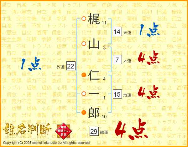 梶(11画)山(3画) 仁(4画)一(1画)郎(10画)
