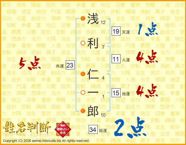 浅(12画)利(7画) 仁(4画)一(1画)郎(10画)