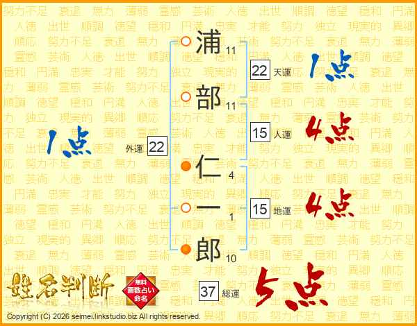 浦(11画)部(11画) 仁(4画)一(1画)郎(10画)