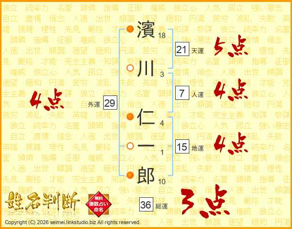 濱(18画)川(3画) 仁(4画)一(1画)郎(10画)