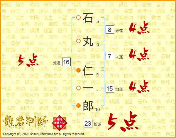 石(5画)丸(3画) 仁(4画)一(1画)郎(10画)