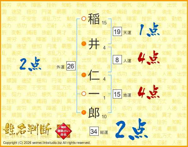 稲(15画)井(4画) 仁(4画)一(1画)郎(10画)