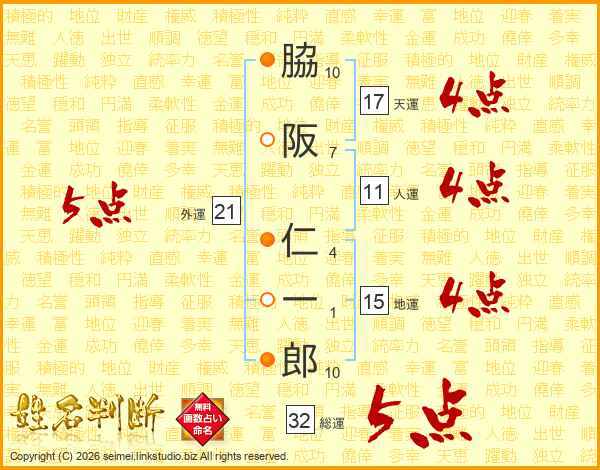 脇阪仁一郎さんの総運は32画の5点!