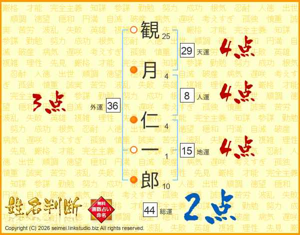 観(25画)月(4画) 仁(4画)一(1画)郎(10画)