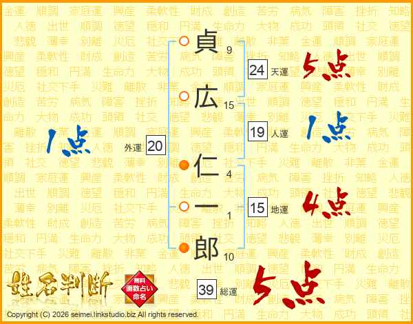 貞(9画)広(15画) 仁(4画)一(1画)郎(10画)