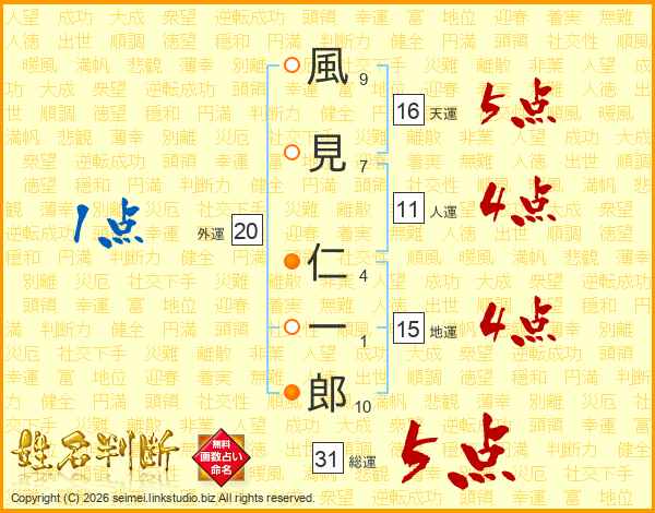 風(9画)見(7画) 仁(4画)一(1画)郎(10画)