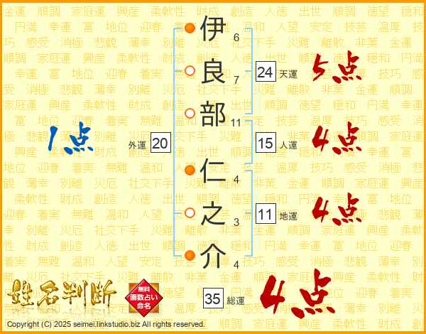 伊(6画)良(7画)部(11画) 仁(4画)之(3画)介(4画)