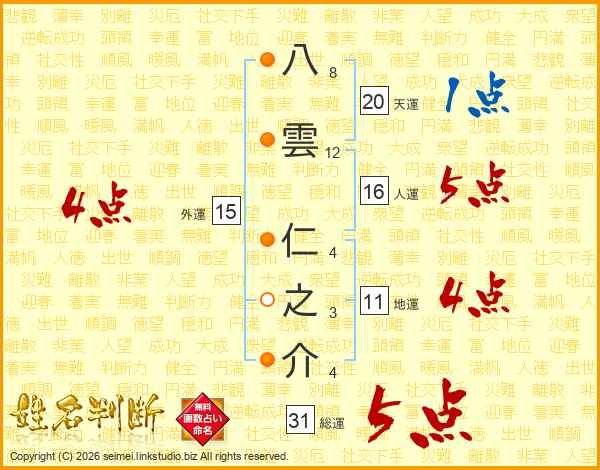 八雲仁之介さんの総運は31画の5点!