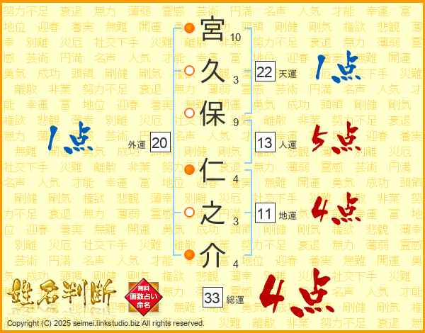 宮(10画)久(3画)保(9画) 仁(4画)之(3画)介(4画)