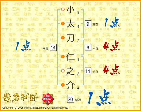 小(3画)太(4画)刀(2画) 仁(4画)之(3画)介(4画)